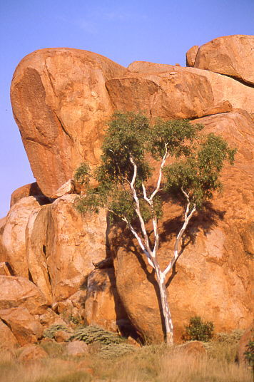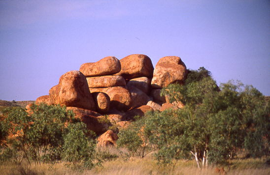 Nach den Mythen der Aborigines sind diese runden Felsen die Eier der Regenbogenschlange,