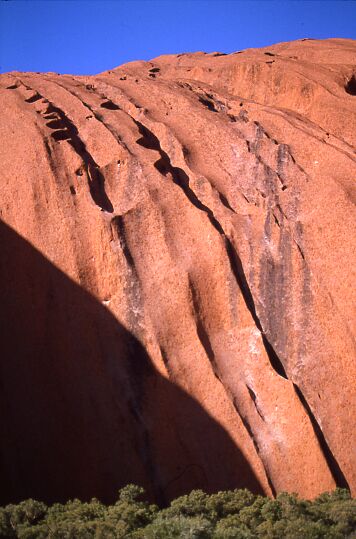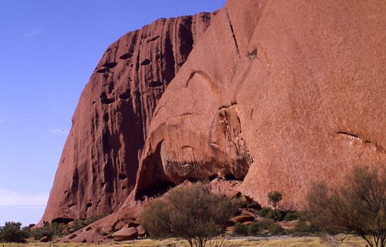 Der Uluru, besteht aus Sedimenten eines langsam fließenden Flusses. Diese Sedimentschicht wurde im Laufe der Jahre (ca. 600 Mio Jahre) aufgerichtet. Nun guckt ein 2,4x3,6 km² großer Block 348 m aus der Ebene (867 mNN). Es ist nur ein, wie bei einem Eisberg, kleiner Teil sichtbar. Der Fels soll insgesamt ca. 2 km hoch sein.Letzte Änderung am 11.11.2003